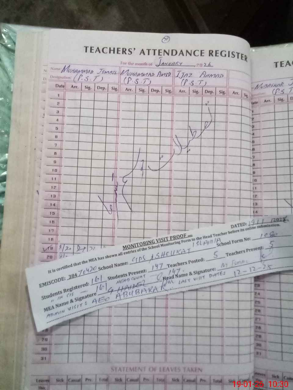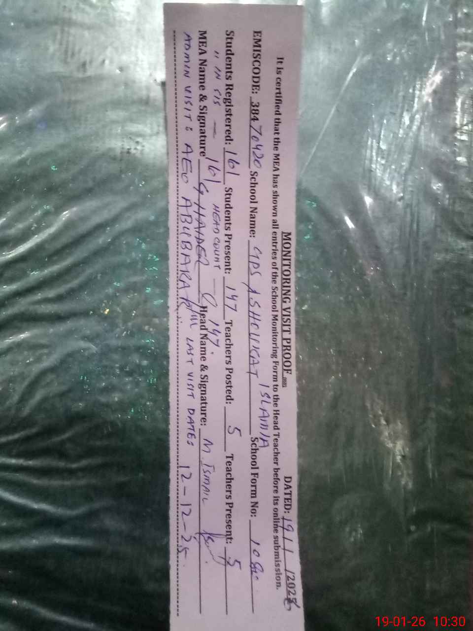 | Attendance Register | Head Teacher | MEA with School | Visit Proof |