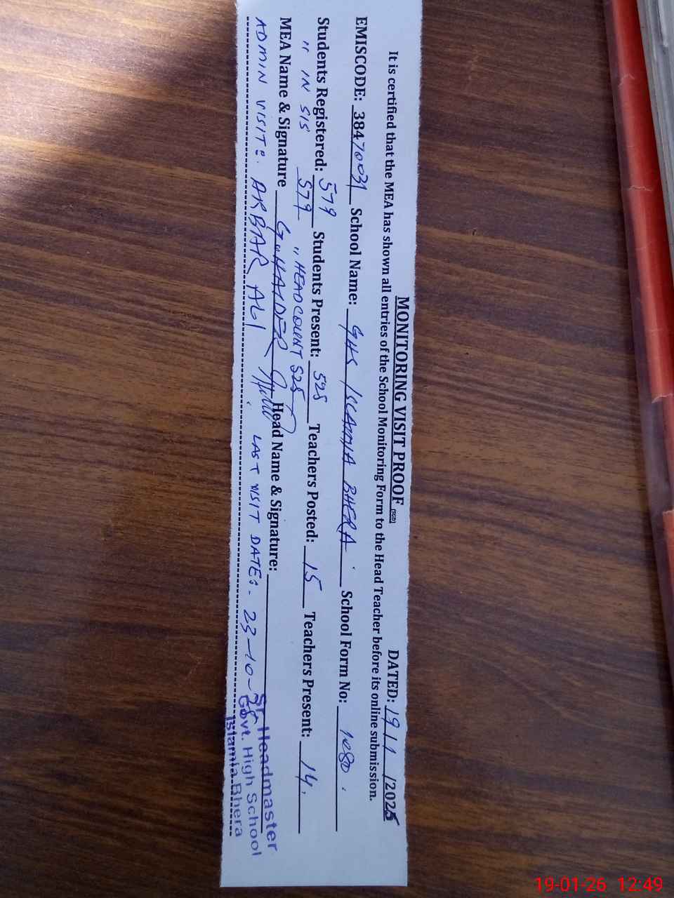 | Certified that this School was Inspected by the Undersigned MEA/DMO Today and the Information Stated Above is as Per Record. | |||||