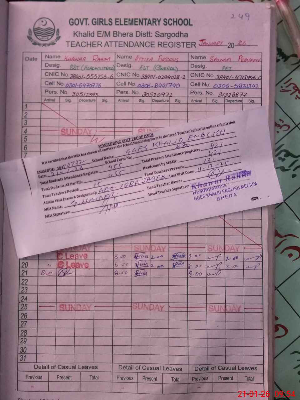 | Name: Kh**** Ra**** Designation: (School Headmaster's/Headmistress's) SST (Arts) Phone/Cell Number: 03**** |