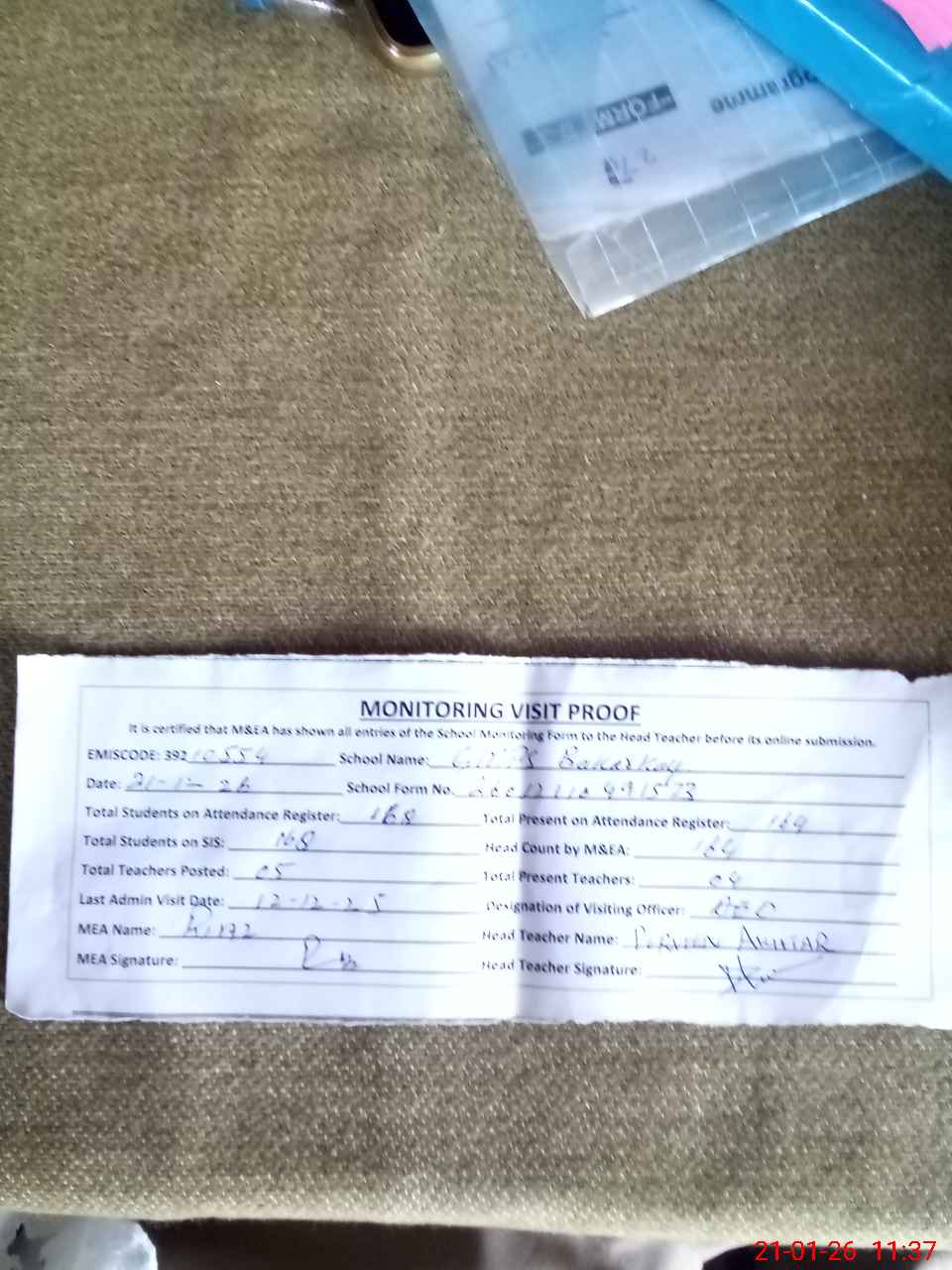 | Attendance Register | Head Teacher | MEA with School | Visit Proof |