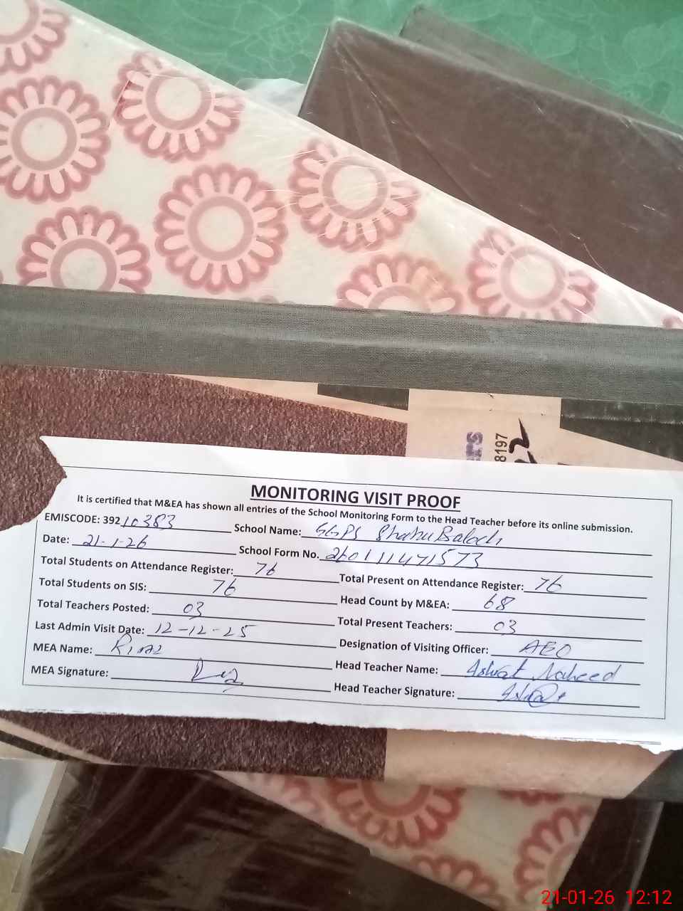 | Attendance Register | Head Teacher | MEA with School | Visit Proof |