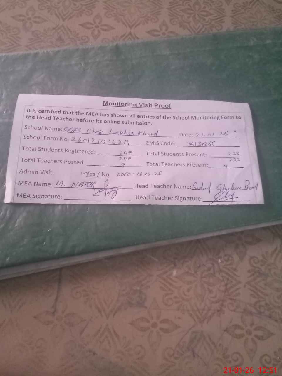 | Attendance Register | Head Teacher | MEA with School | Visit Proof |