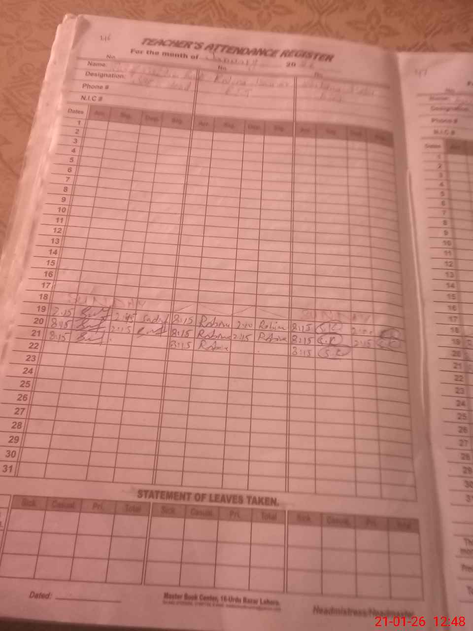 | CNIC | Full Name | Designation | R/C | Absence During Last Calender Month |