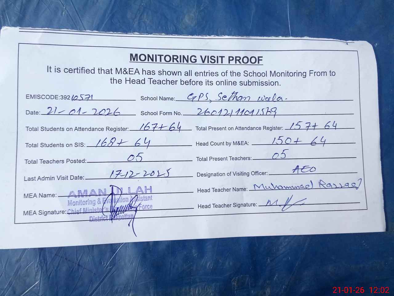 | Attendance Register | Head Teacher | MEA with School | Visit Proof |