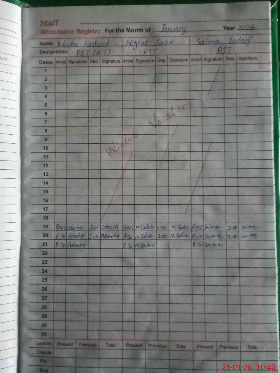 | Leave | Duty | Absent | Maternity | Medical | Ex- Pak |