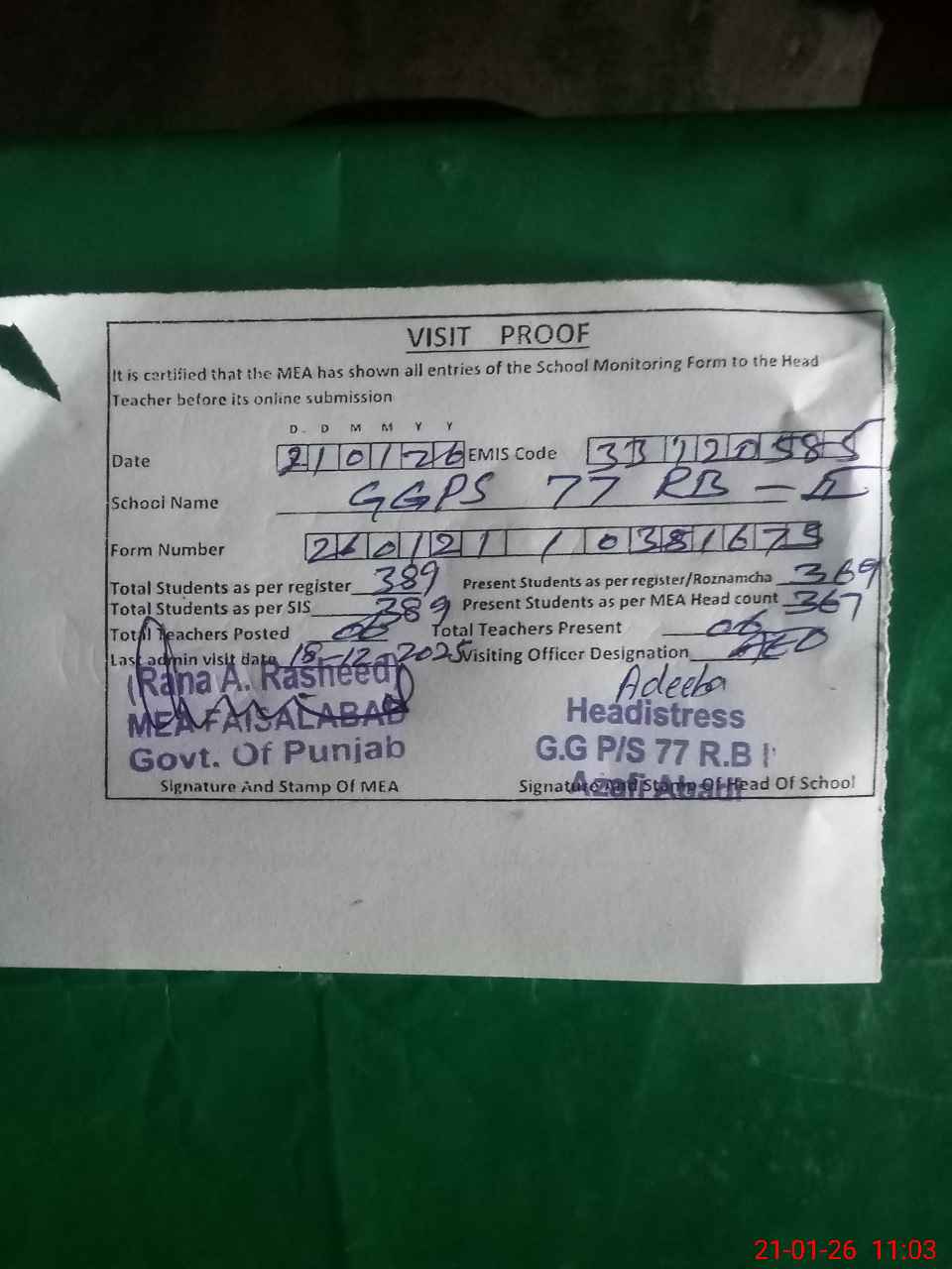 | Attendance Register | Head Teacher | MEA with School | Visit Proof |