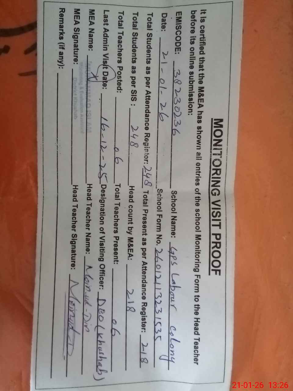 | EMIS Code: 38230236 | Name of School: GPS LABOUR COLONY | |||