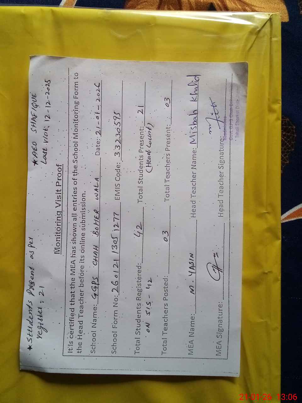 | Attendance Register | Head Teacher | MEA with School | Visit Proof |
