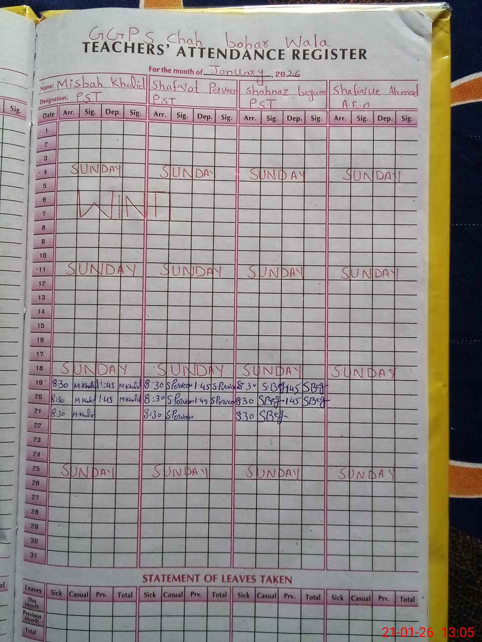 | CNIC | Full Name | Designation | R/C | Absence During Last Calender Month |