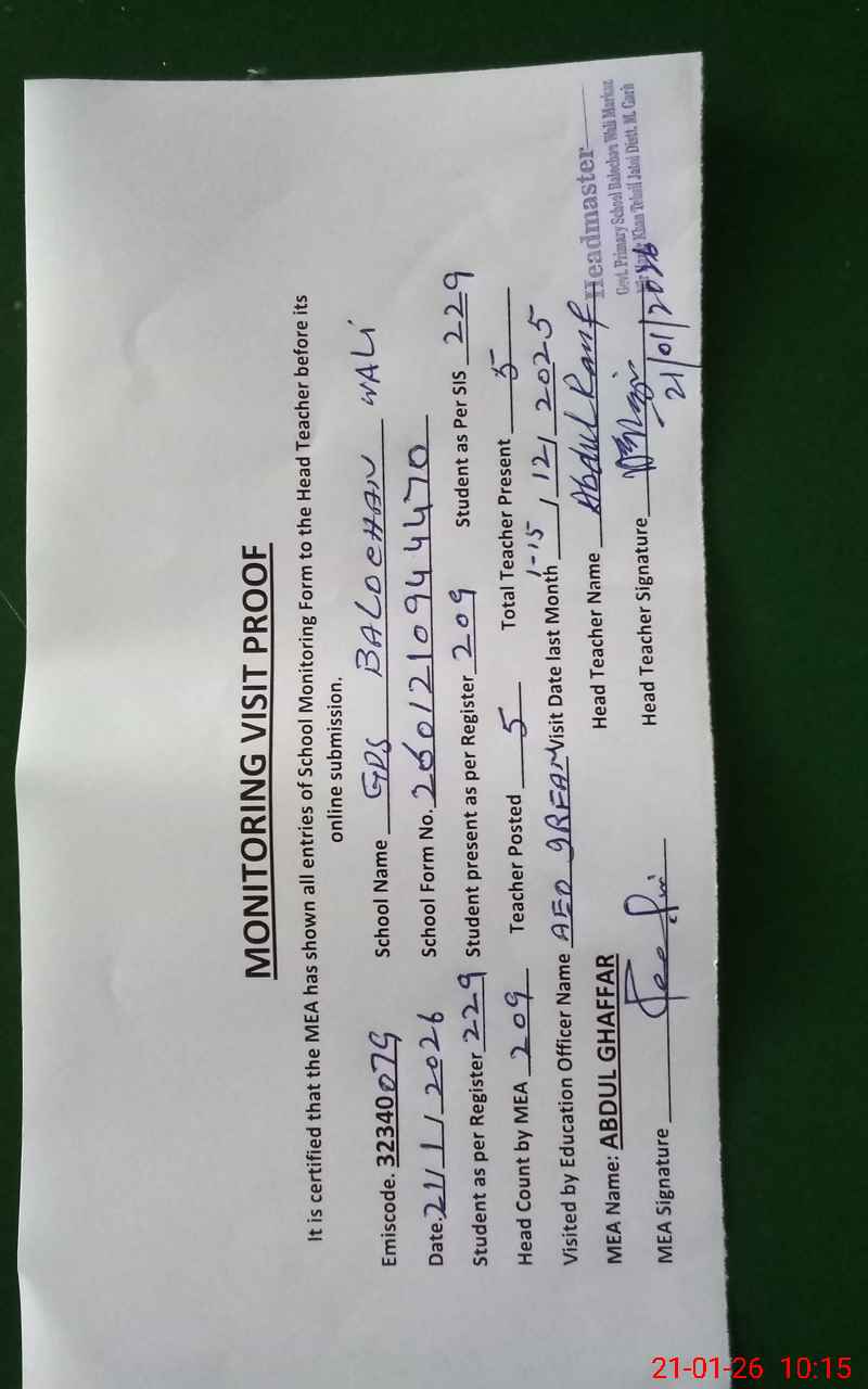 | EMIS Code: 32340079 | Name of School: GPS BALOCHAN WALI | |||