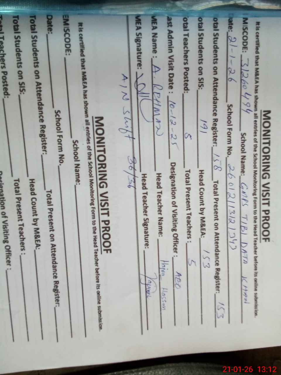 | EMIS Code: 31260494 | Name of School: GMPS MODEL TIBBI DATA KHAN | |||