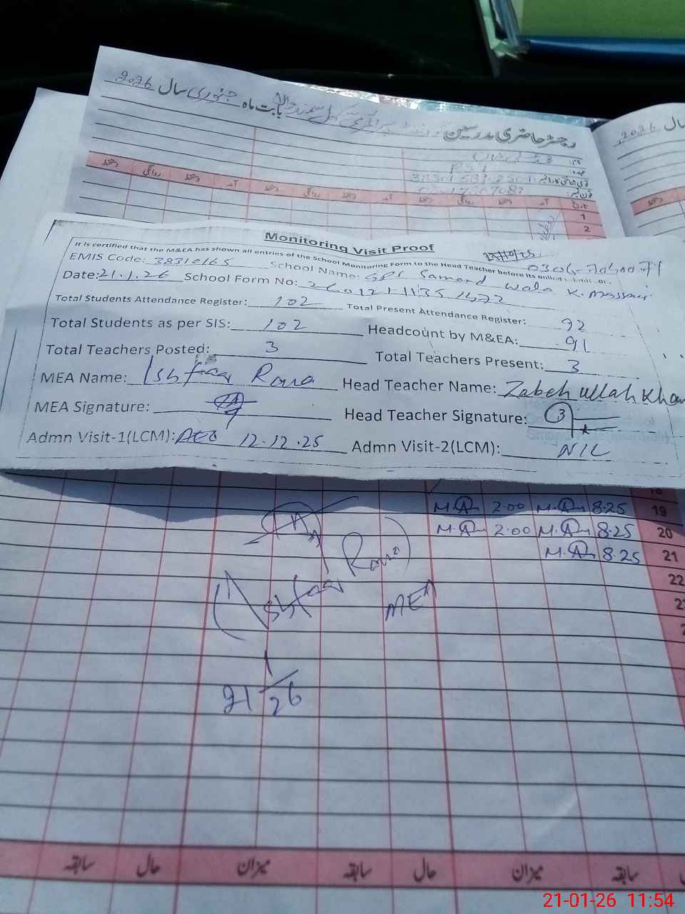 | Attendance Register | Head Teacher | MEA with School | Visit Proof |