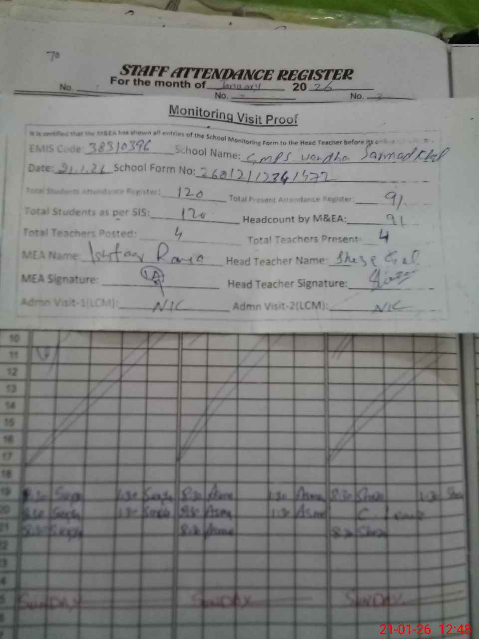 | Attendance Register | Head Teacher | MEA with School | Visit Proof |