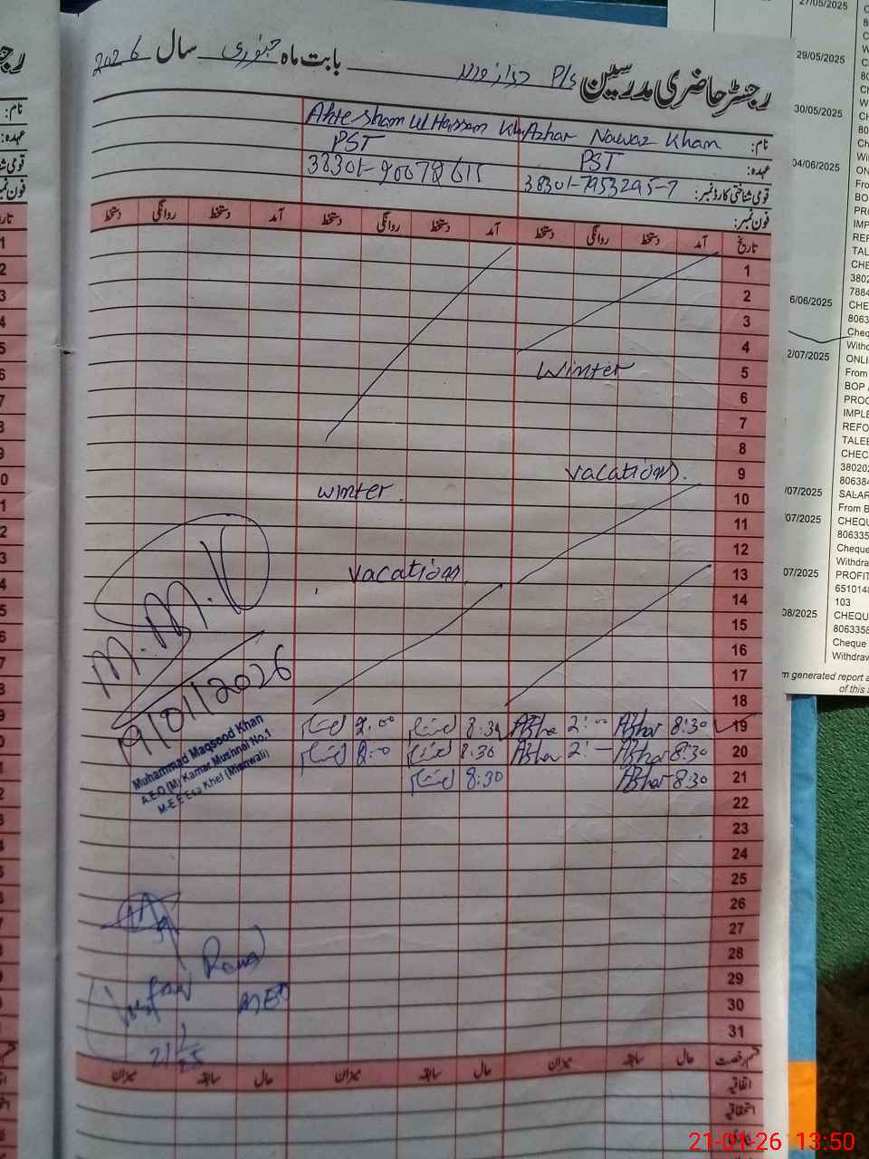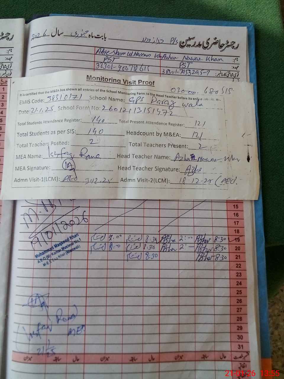 | Name: Az**** Na**** Kh**** Designation: (School Headmaster's/Headmistress's) PST Phone/Cell Number: 03**** |