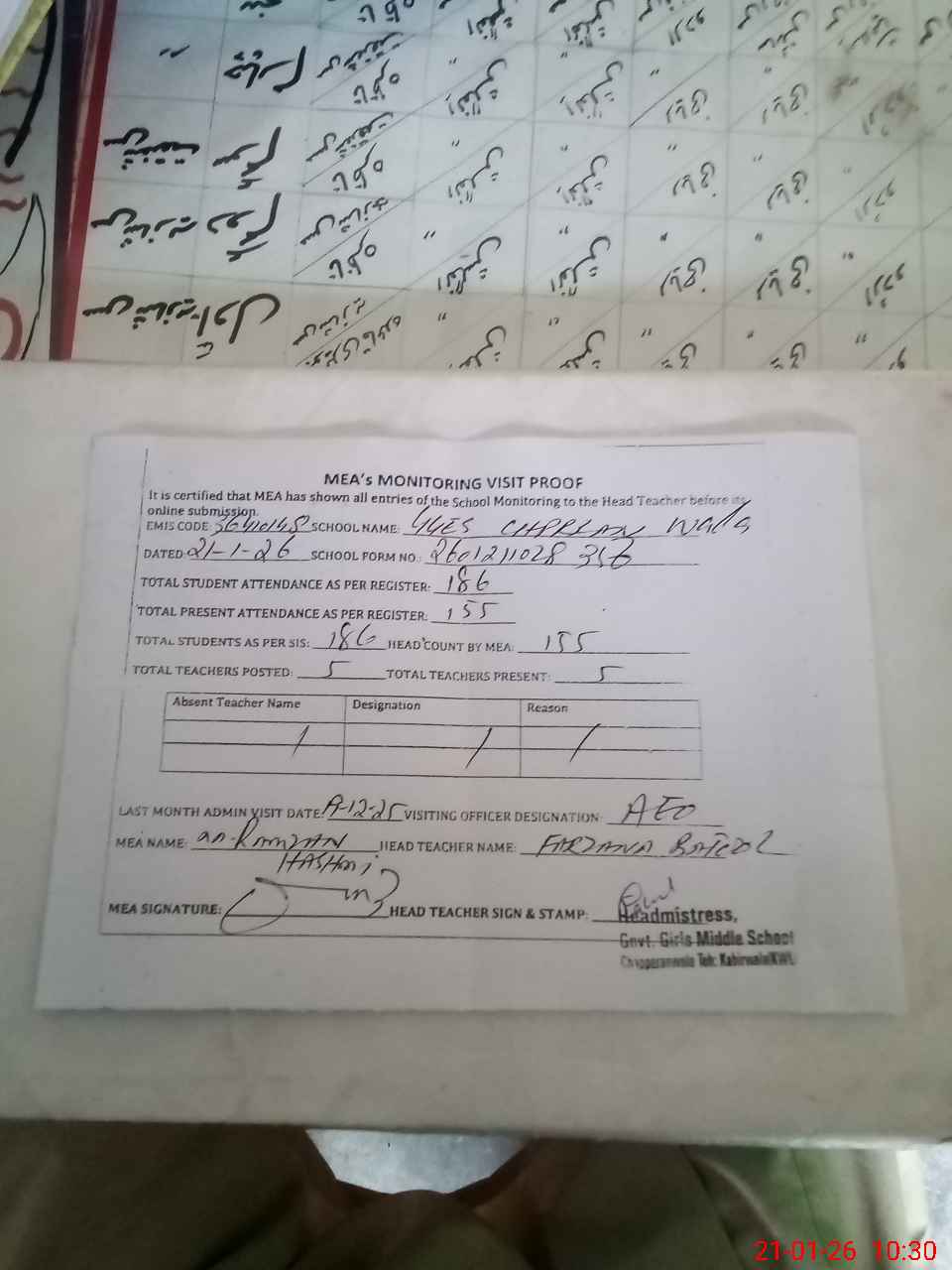 | Attendance Register | Head Teacher | MEA with School | Visit Proof |