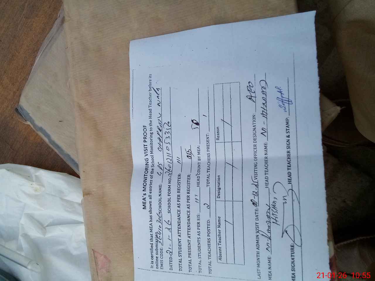 | Attendance Register | Head Teacher | MEA with School | Visit Proof |