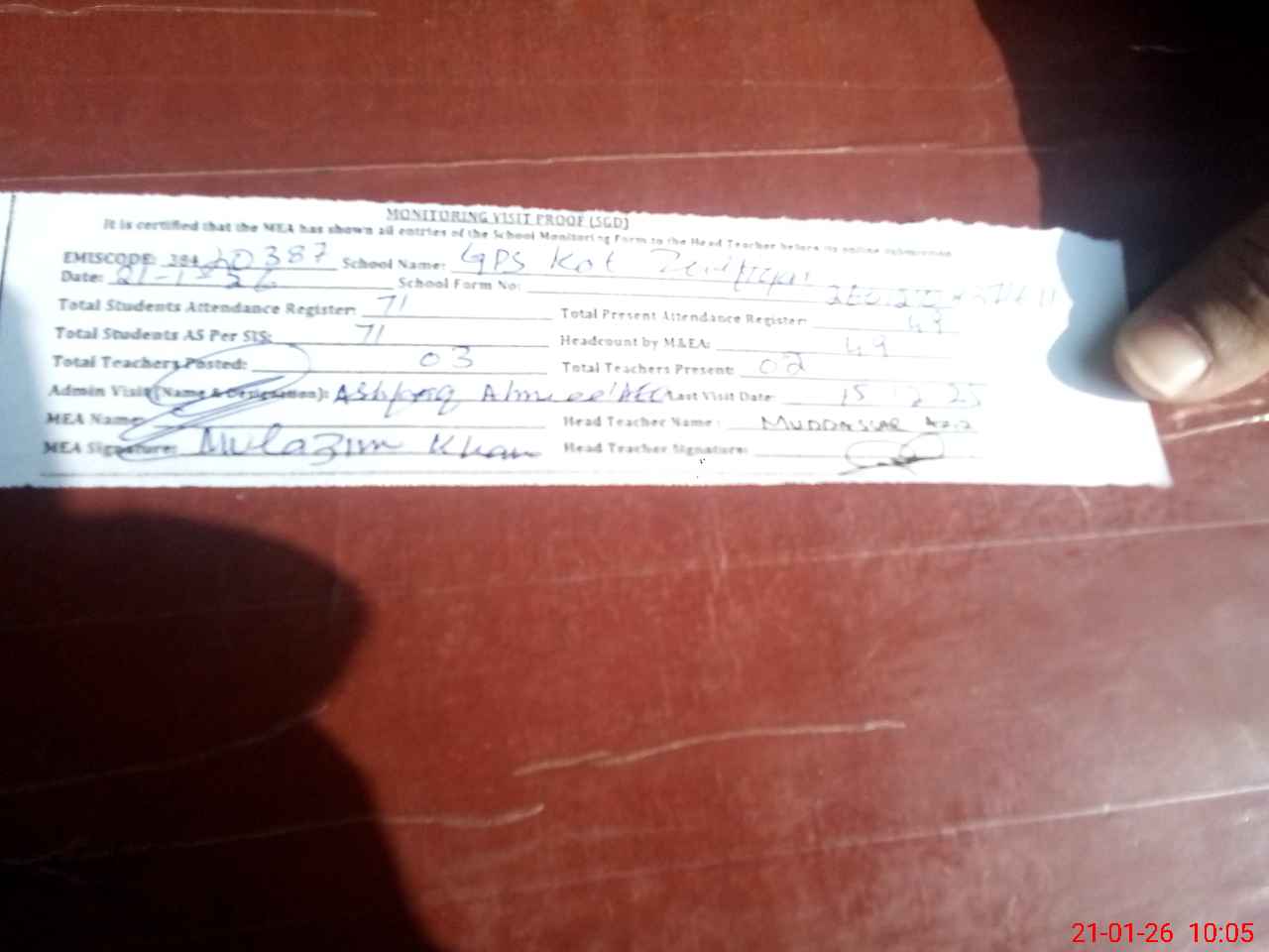 | Attendance Register | Head Teacher | MEA with School | Visit Proof |