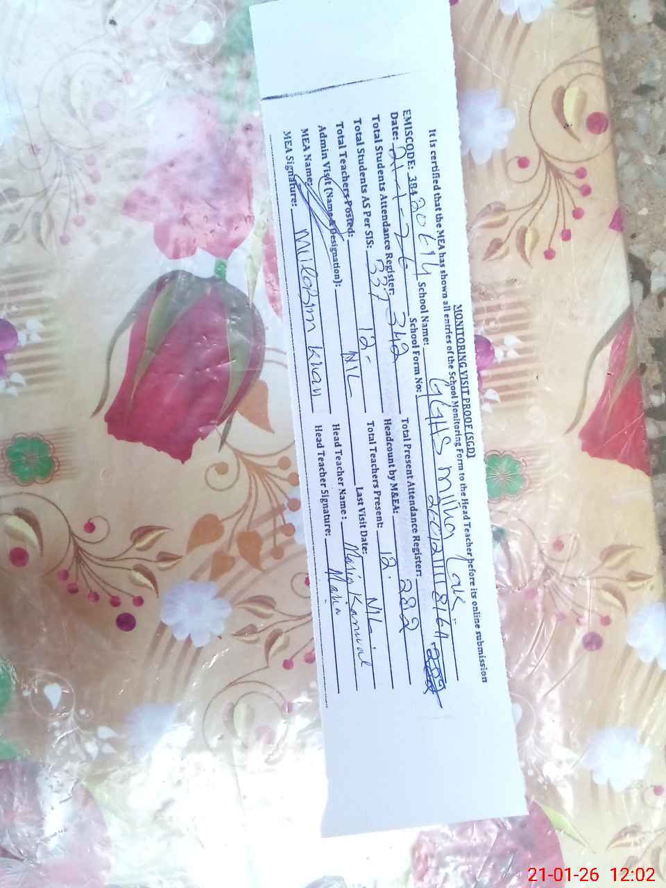 | Attendance Register | Head Teacher | MEA with School | Visit Proof |