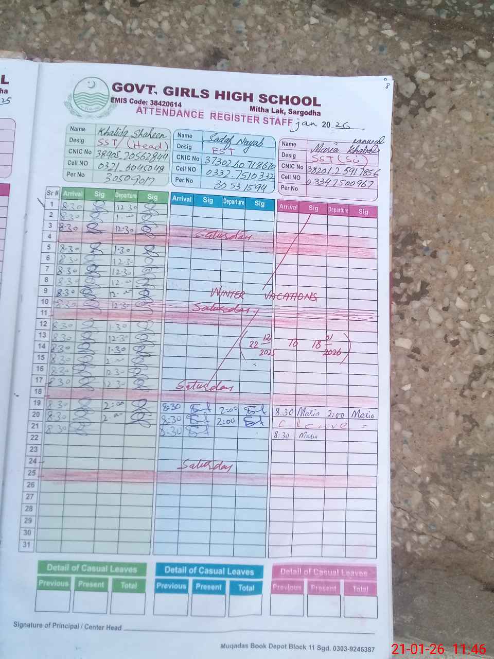 | CNIC | Full Name | Designation | R/C | Absence during last cal. month |
