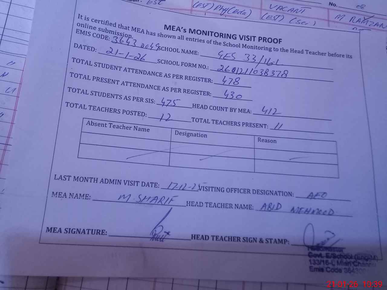 | Attendance Register | Head Teacher | MEA with School | Visit Proof |