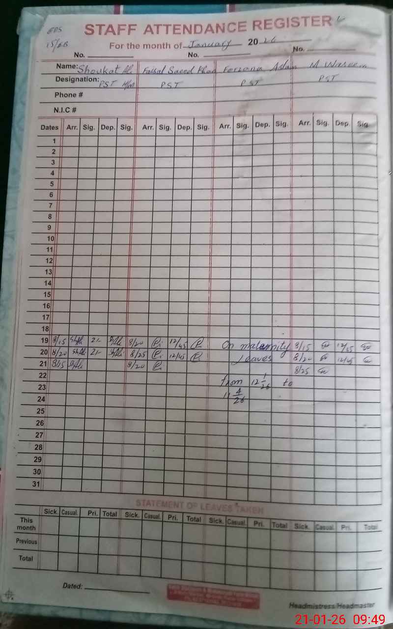 | Name: SH**** AL**** Designation: (School Headmaster's/Headmistress's) PST Phone/Cell Number: 03**** |