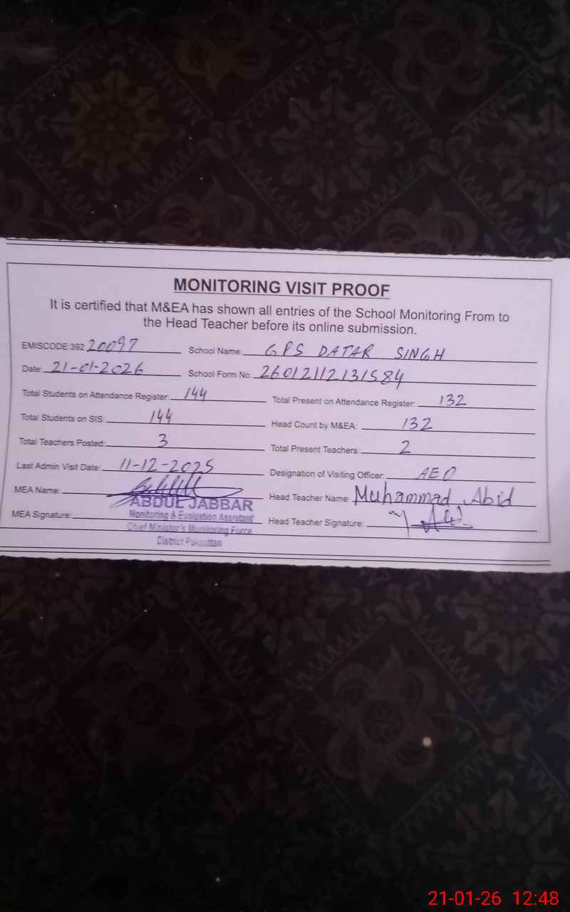 | EMIS Code: 39220097 | Name of School: GPS DATAR SINGH | |||