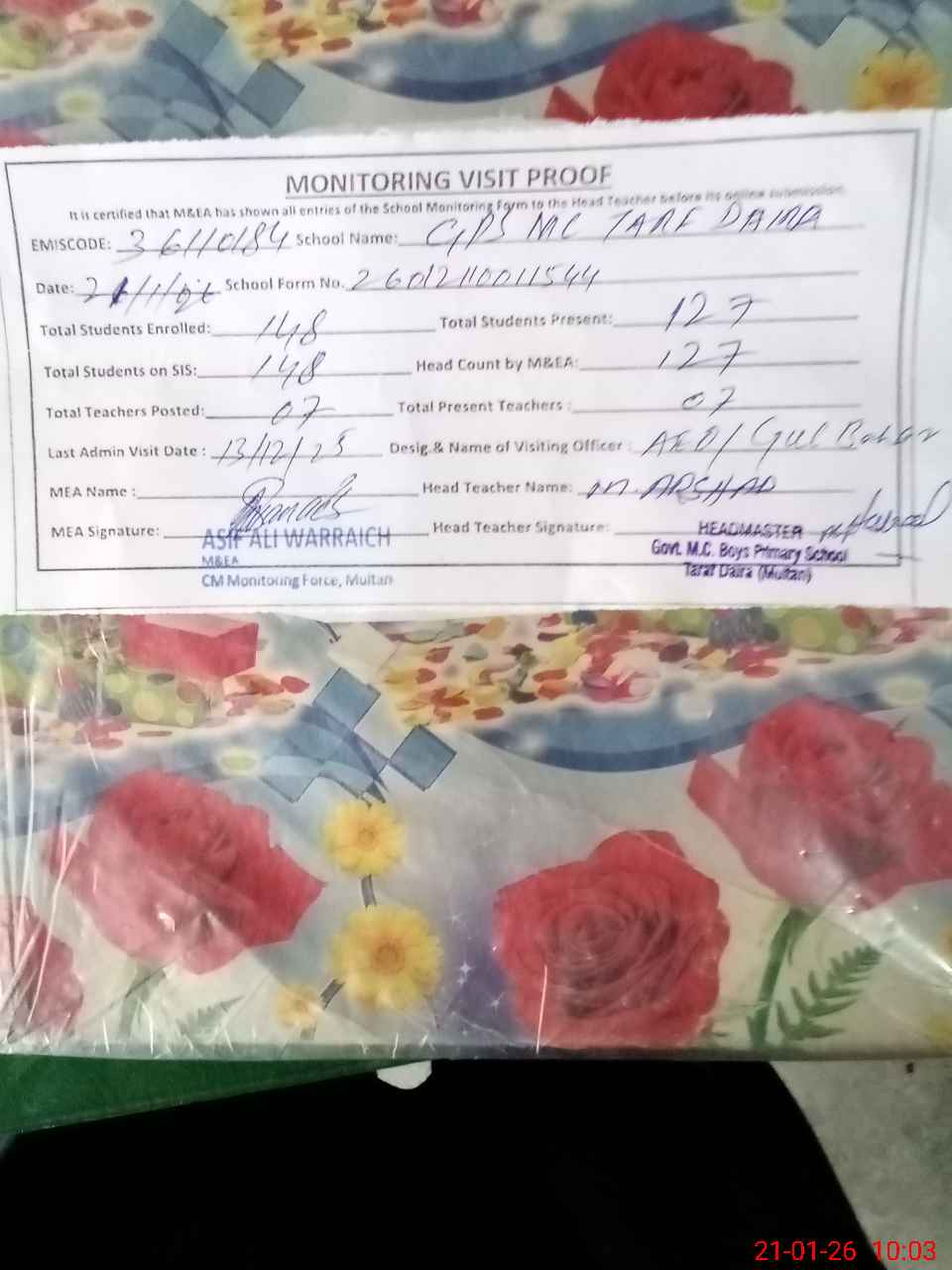 | EMIS Code: 36110184 | Name of School: GPS MC TARAF DAIRA MULTAN | |||