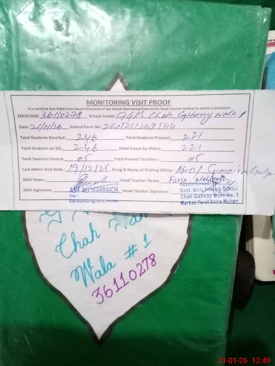 | EMIS Code: 36110278 | Name of School: GGPS CHAH GAHNAY WALA NO 1 MULTAN | |||