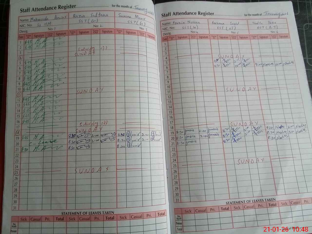 | CNIC | Full Name | Designation | R/C | Absence During Last Calender Month |