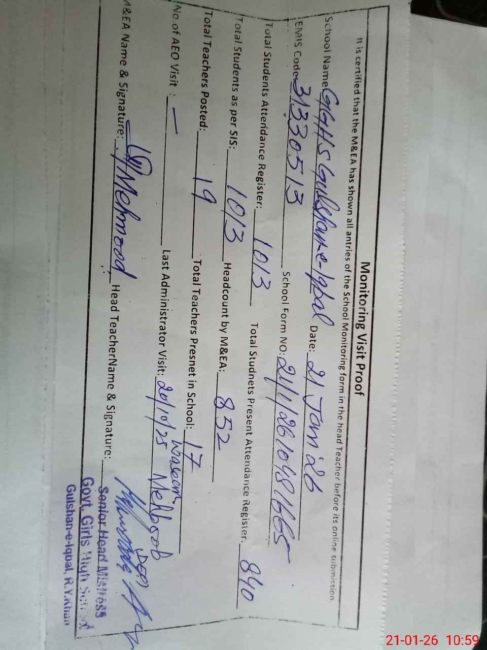 | Monitoring Date: 21-01-2026 | Start Time: 21-01-2026 10:24 AM | End Time: 21-01-2026 11:00 AM | Name of MEA: Ma**** UlHa**** | |