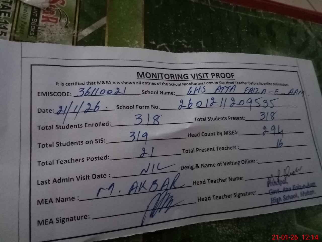 | Attendance Register | Head Teacher | MEA with School | Visit Proof |