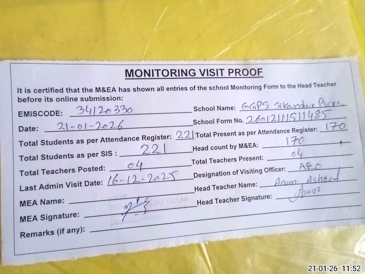 | EMIS Code: 34120330 | Name of School: GGPS SIKANDAR PURA | |||