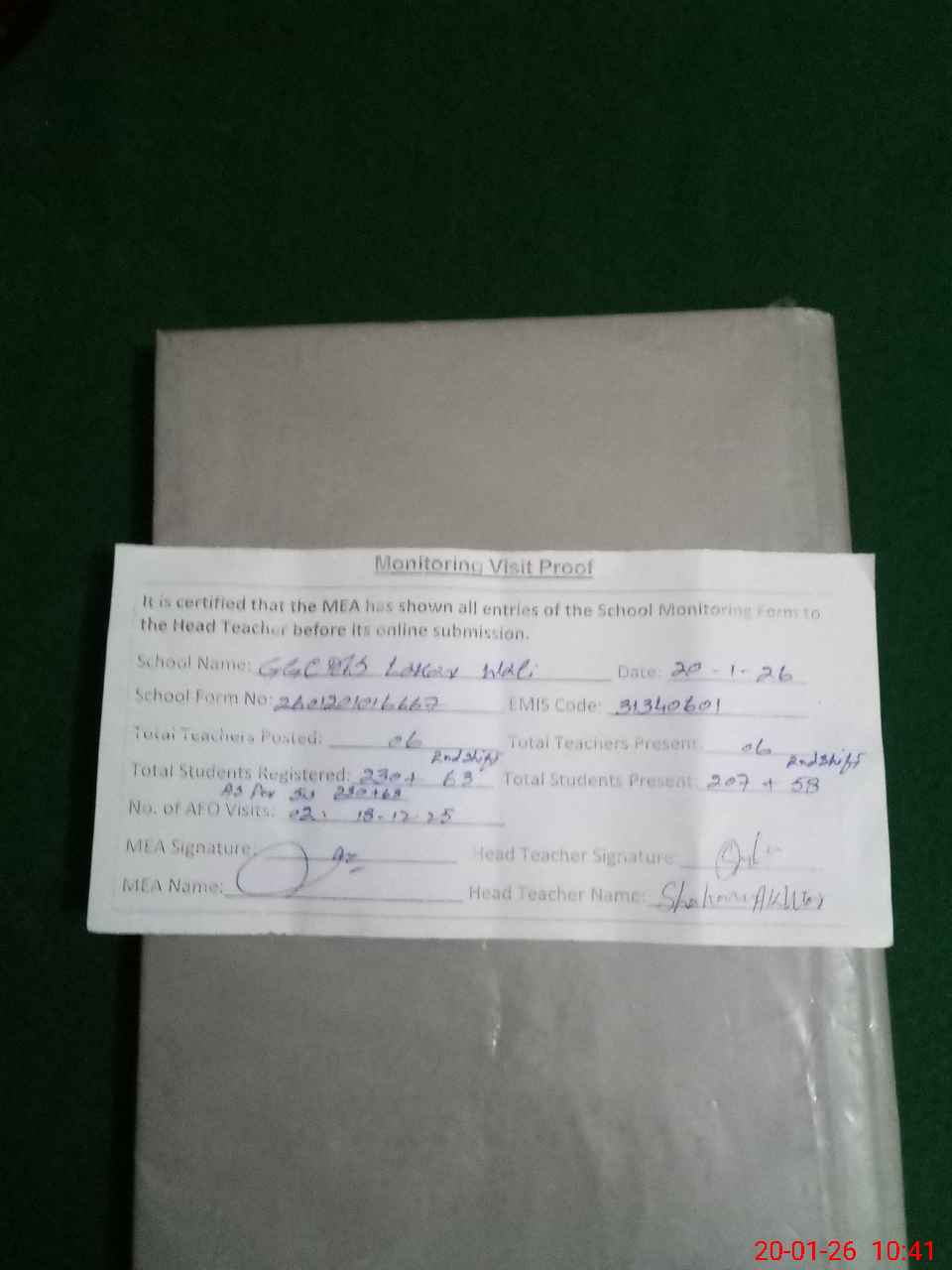 | Attendance Register | Head Teacher | MEA with School | Visit Proof |