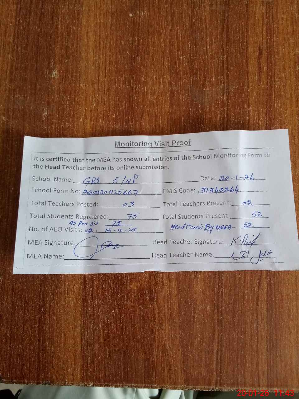 | Attendance Register | Head Teacher | MEA with School | Visit Proof |