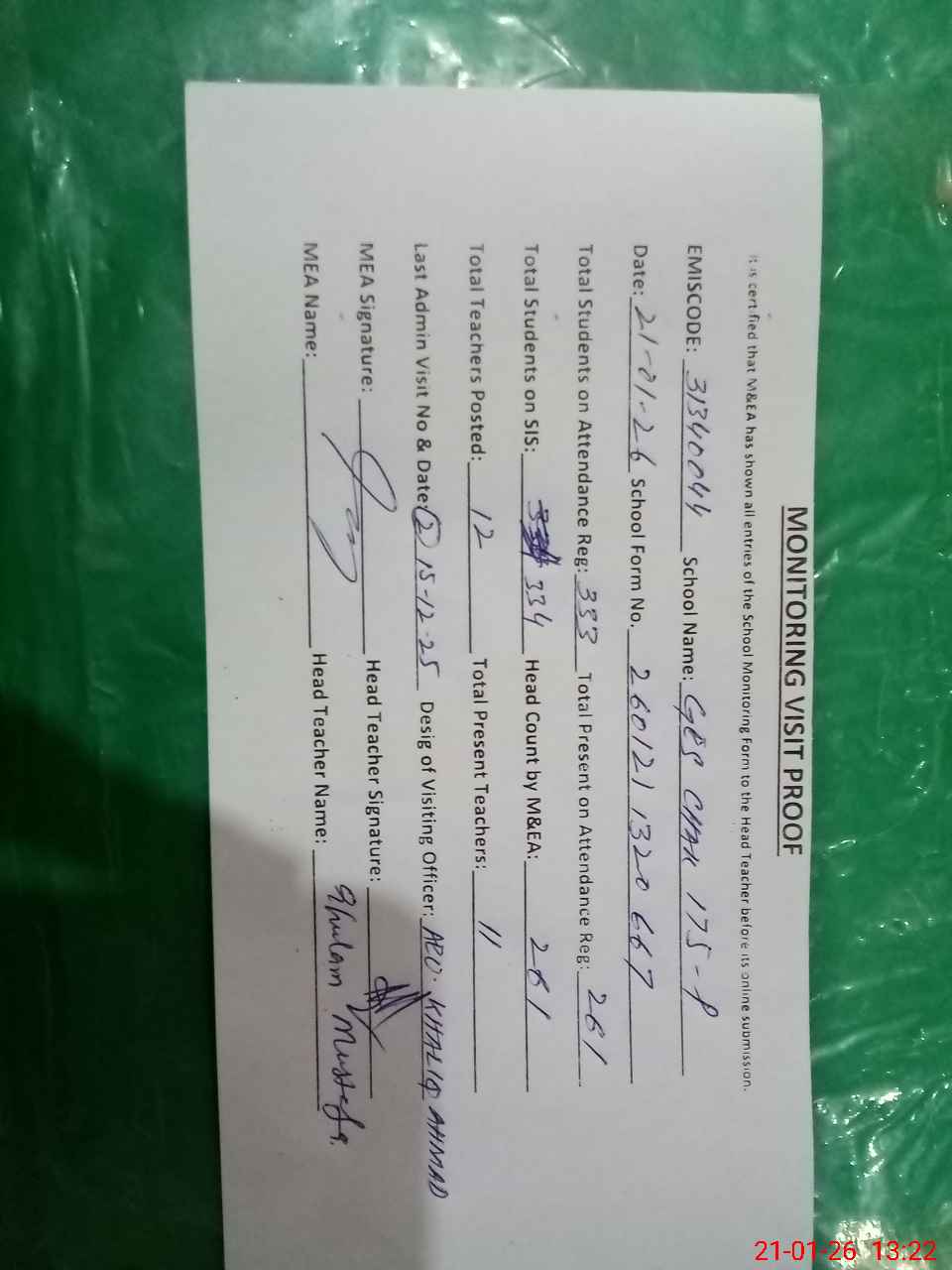 | EMIS Code: 31340044 | Name of School: GES CHAK NO 175/P | |||