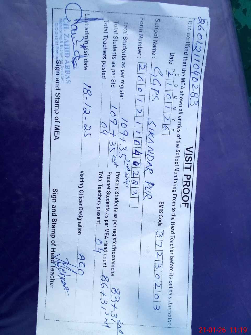 | Attendance Register | Head Teacher | MEA with School | Visit Proof |