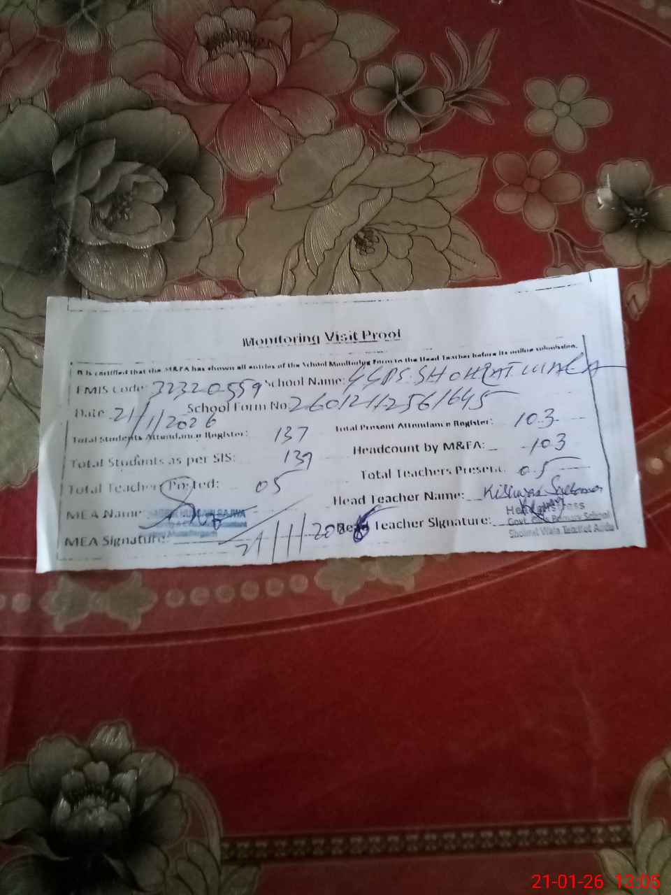 | Attendance Register | Head Teacher | MEA with School | Visit Proof |