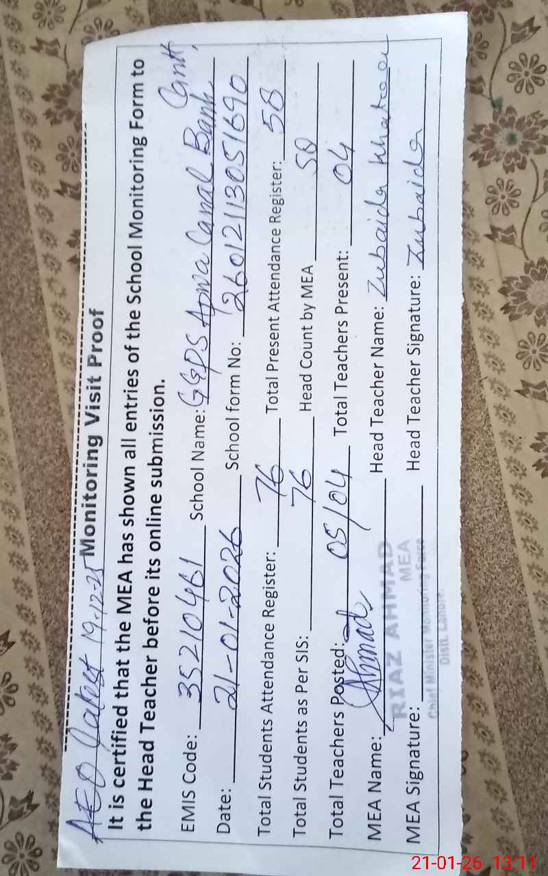 | EMIS Code: 35210461 | Name of School: GGPS APWA CANAL BANK WALTON LAHORE | |||