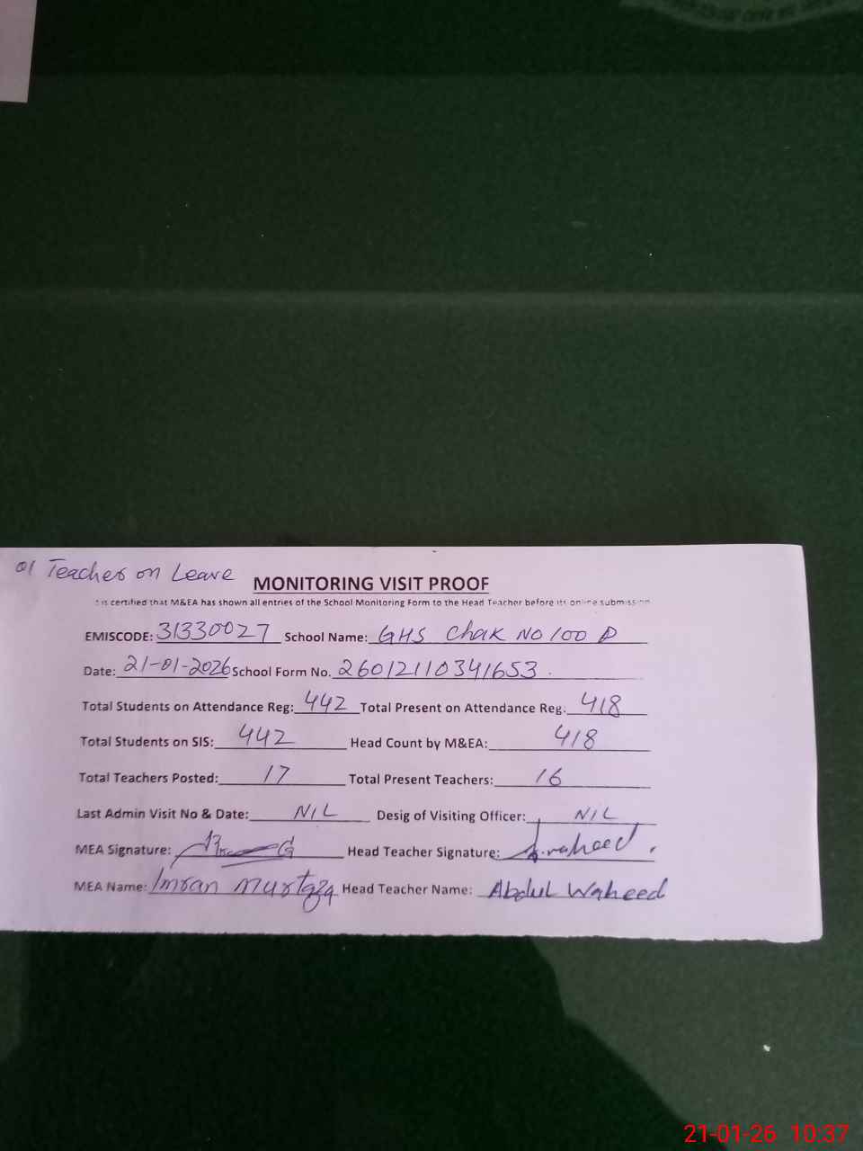 | EMIS Code: 31330027 | Name of School: GHS CHAK NO. 100/P | |||