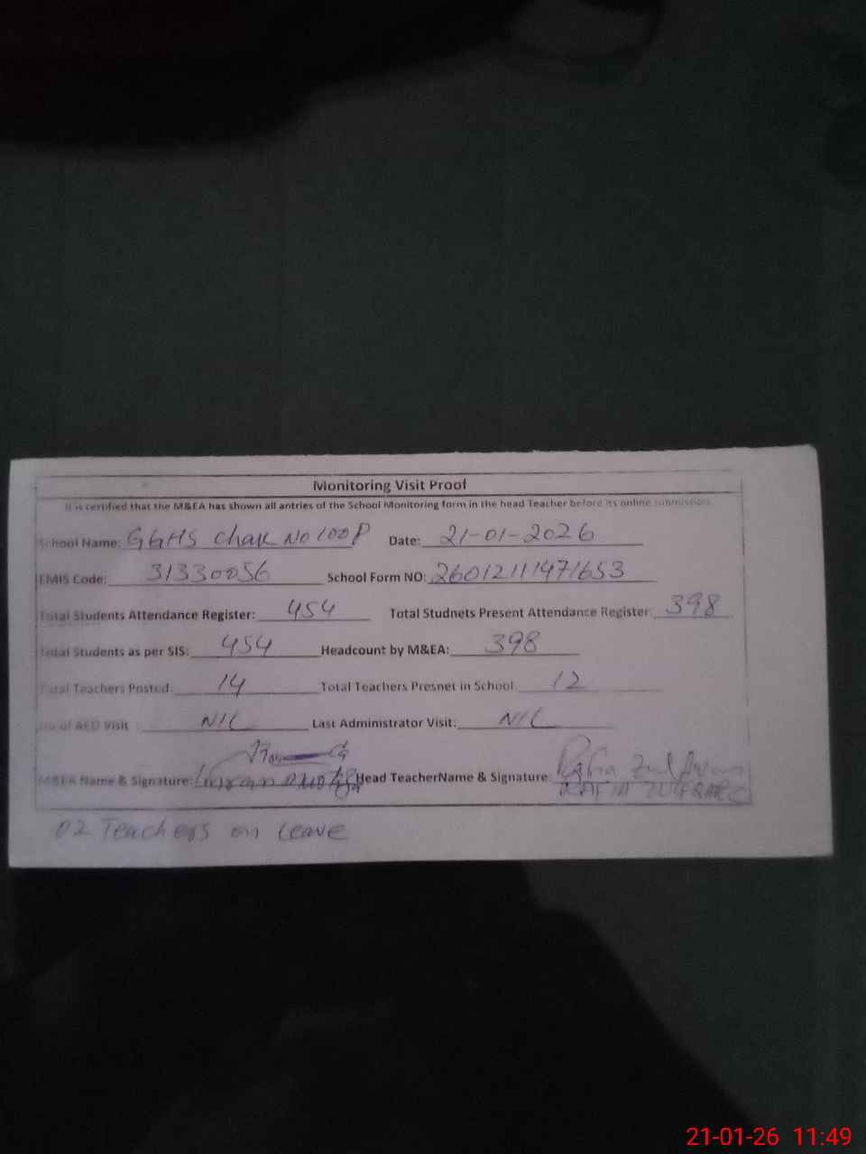 | EMIS Code: 31330056 | Name of School: GGHS CHAK NO. 100/P | |||