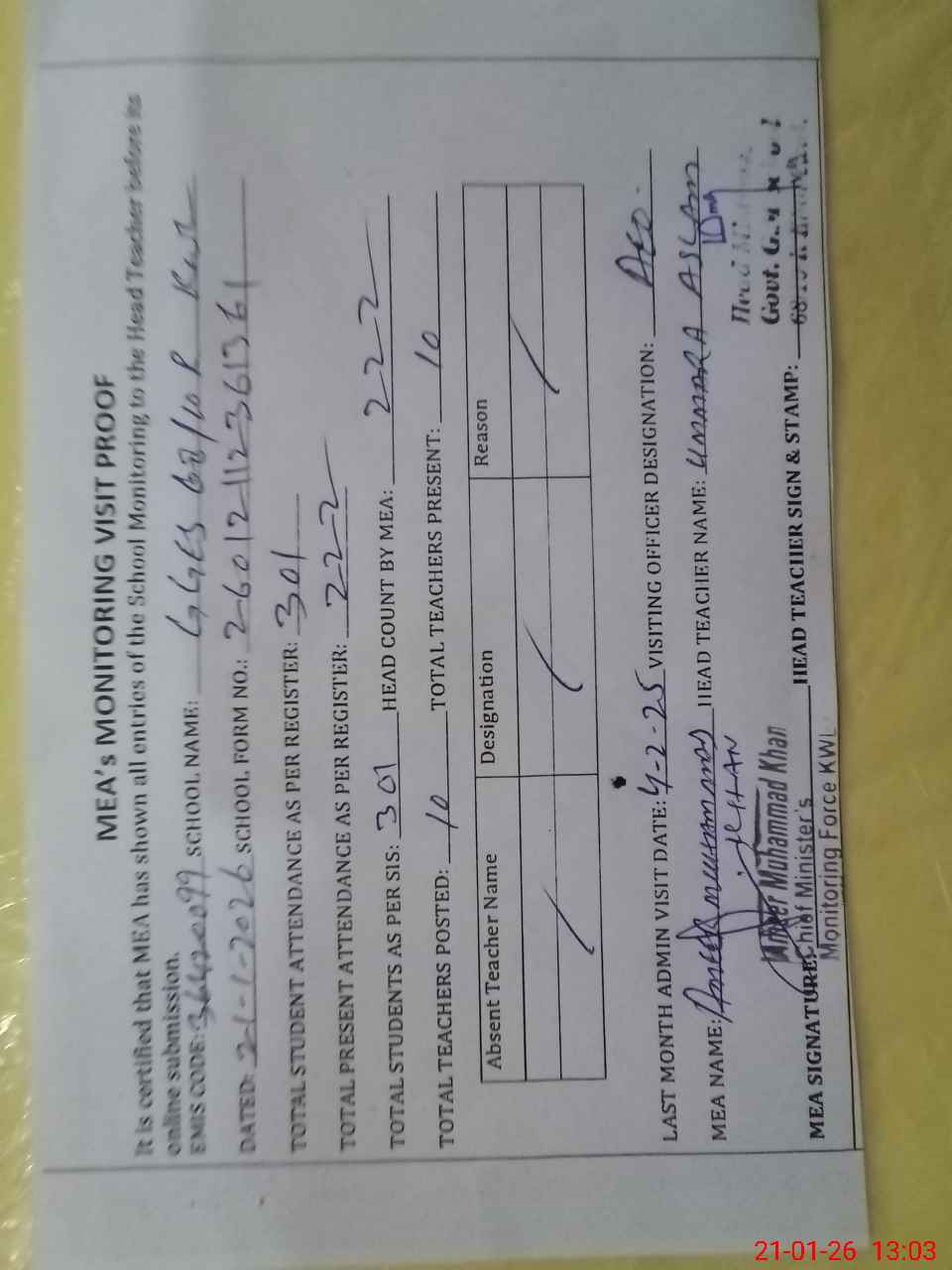 | Attendance Register | Head Teacher | MEA with School | Visit Proof |