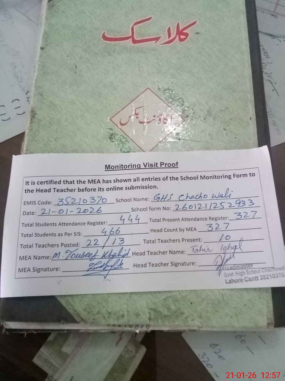 | Attendance Register | Head Teacher | MEA with School | Visit Proof |
