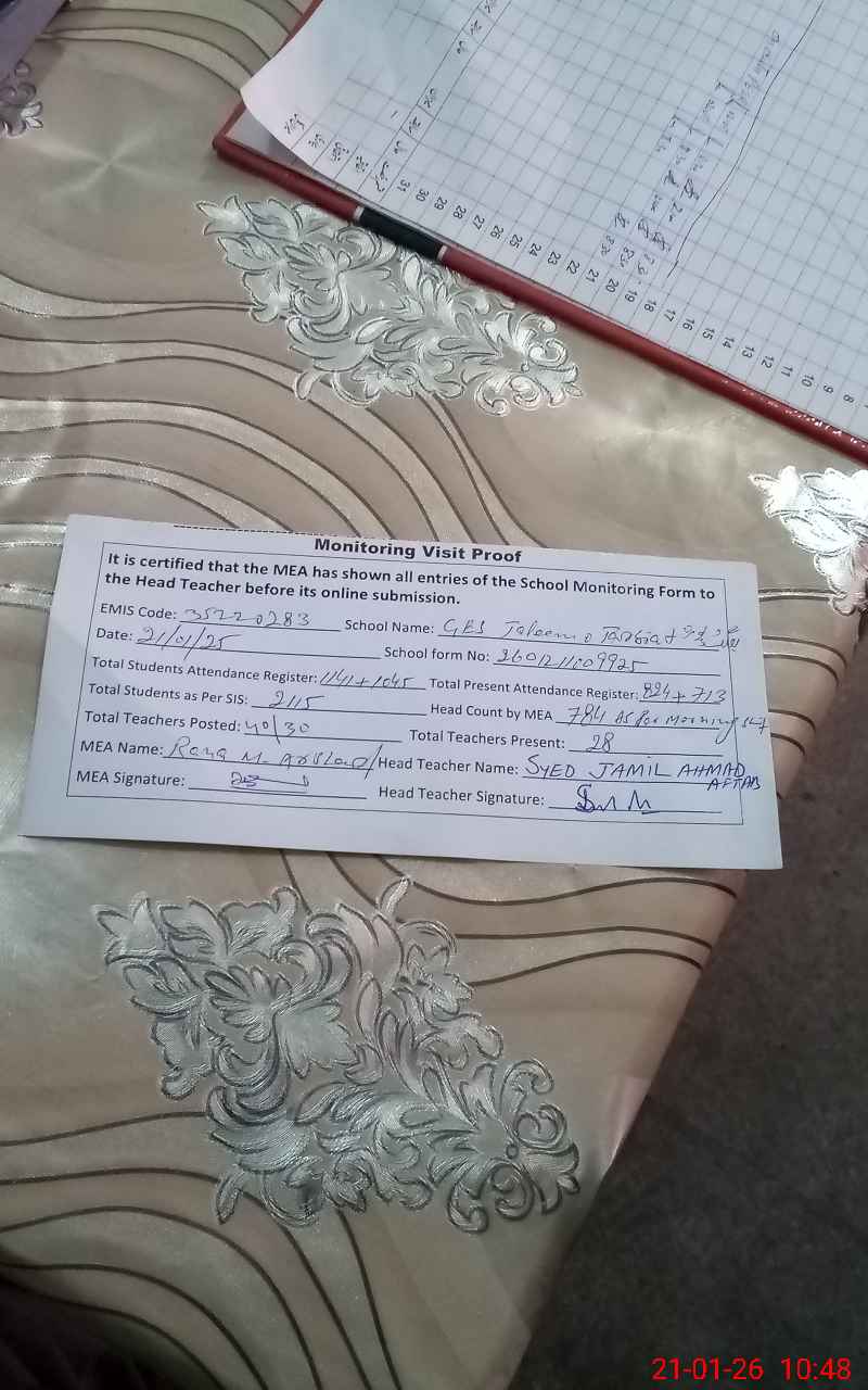 | Remarks (Use Separate Page if Required): Afforsaid school Consist 02 Camps both Camps have Canteen afforsaid school Run As Double Shift School and according to rule double shift school have no Canteen because there are no recess break. Teacher Jamila Bashir EST attendance blank from 02 days and she was not physically present from two days so according to monitoring sop mark her Absent. Ceiling fan very dirty condition both Camps. NSB record not maintain month of December 2025. FTF record not maintain after October,2025 to December 2025. | |||||