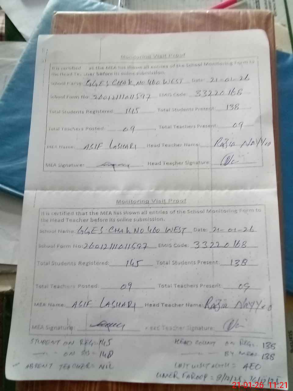 | Attendance Register | Head Teacher | MEA with School | Visit Proof |