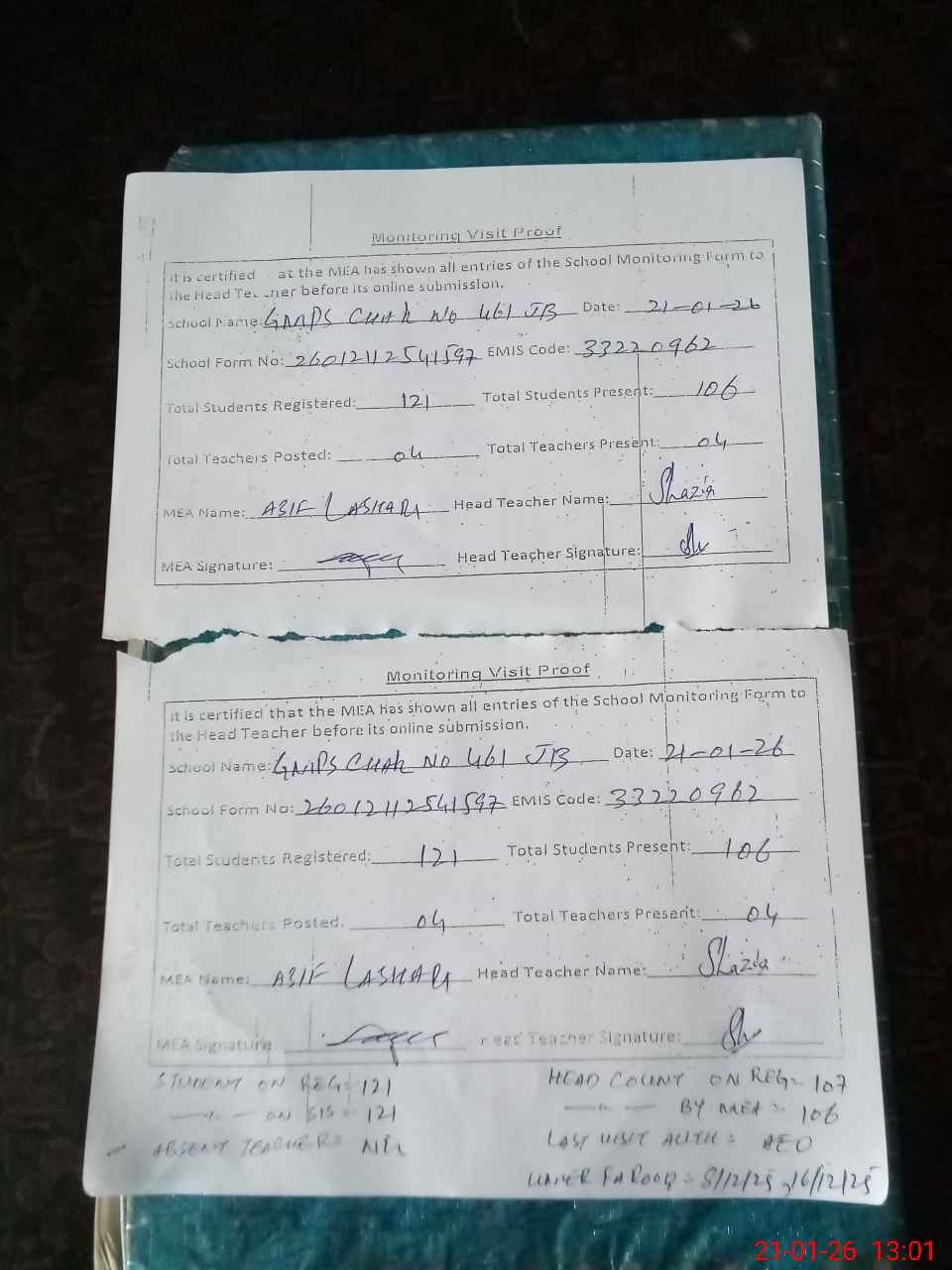 | Attendance Register | Head Teacher | MEA with School | Visit Proof |