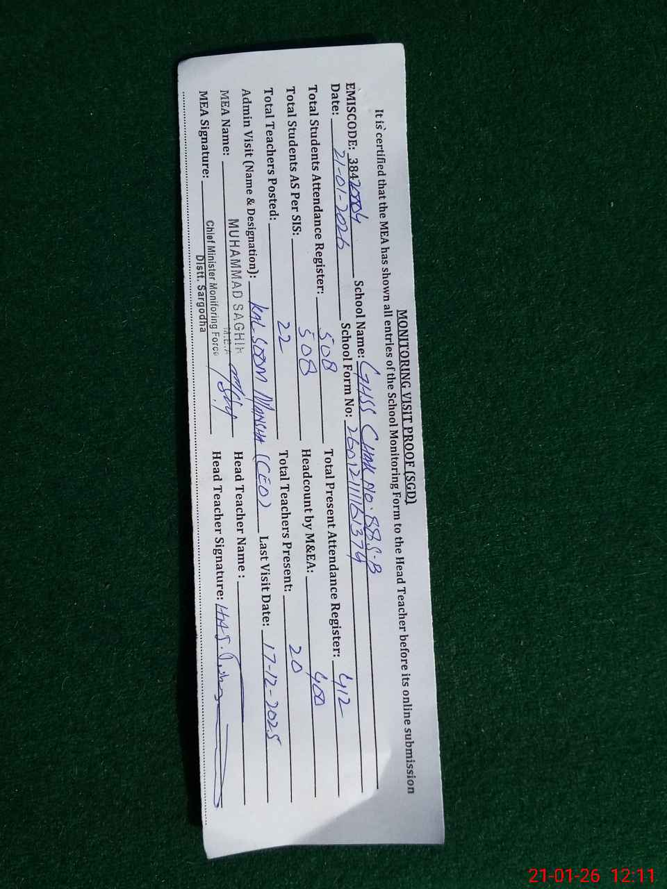 | Attendance Register | Head Teacher | MEA with School | Visit Proof |