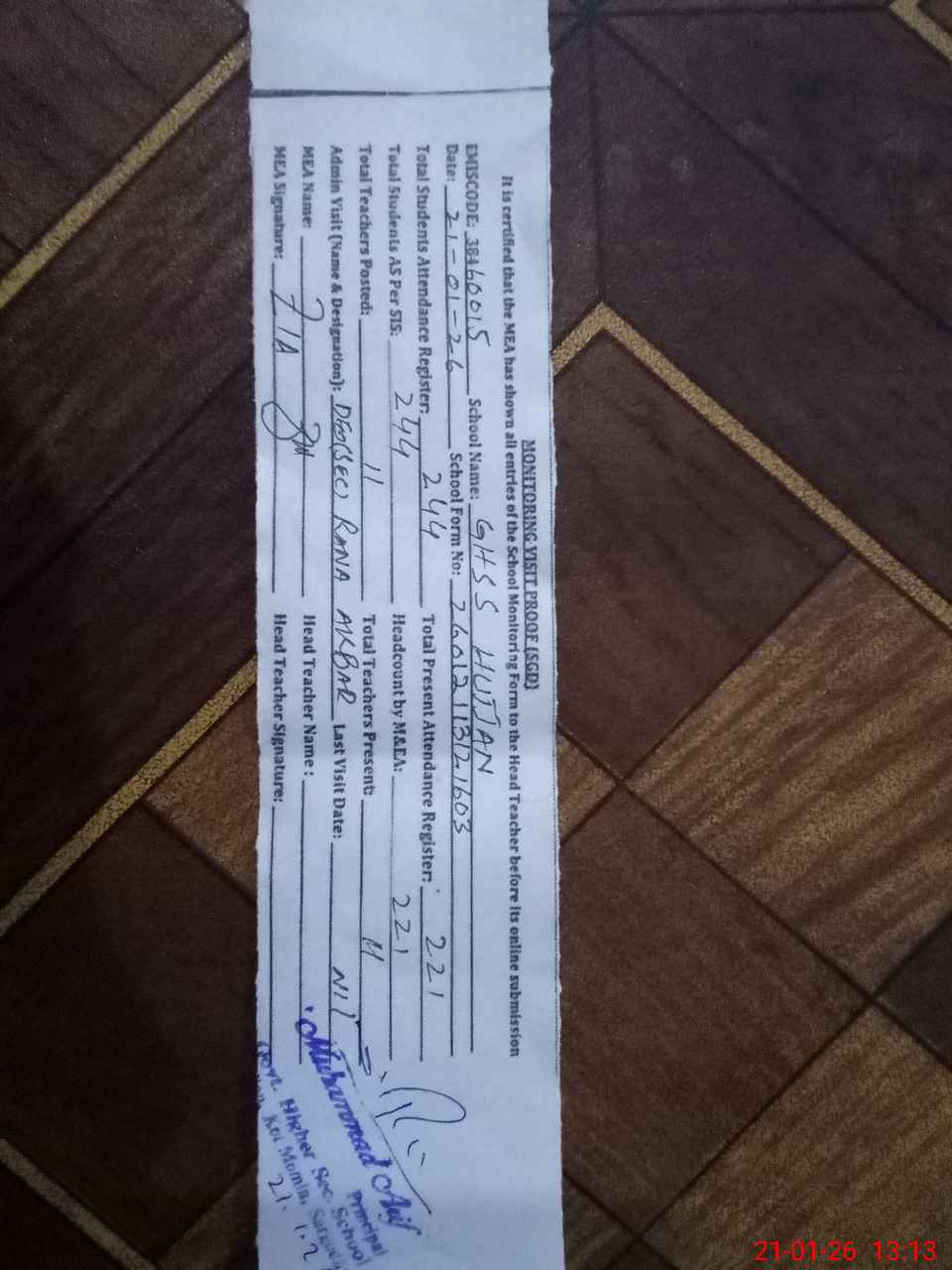 | Attendance Register | Head Teacher | MEA with School | Visit Proof |