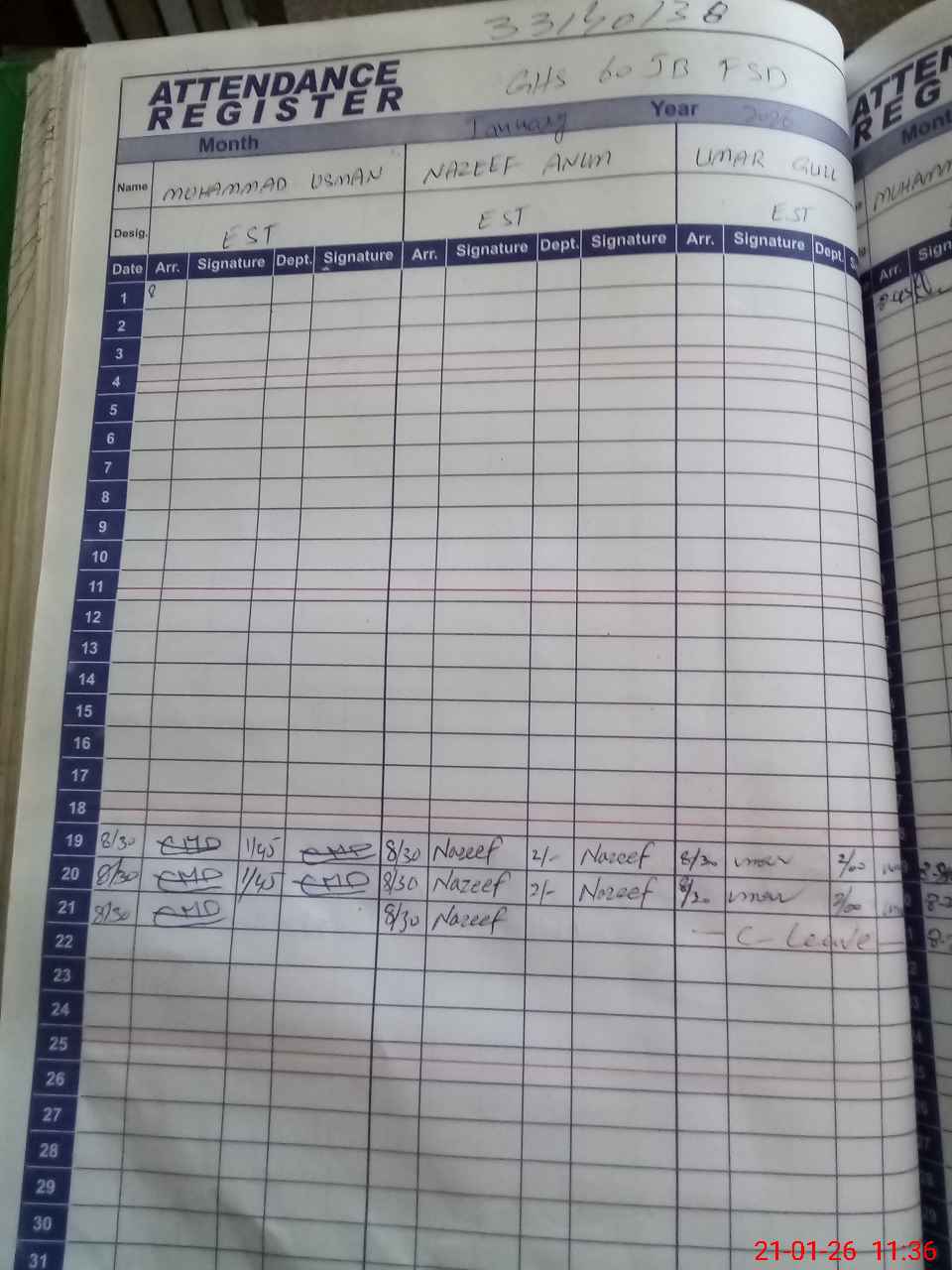 | CNIC | Full Name | Designation | R/C | Absence During Last Calender Month |