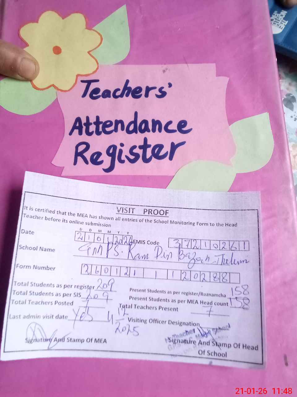 | Attendance Register | Head Teacher | MEA with School | Visit Proof |