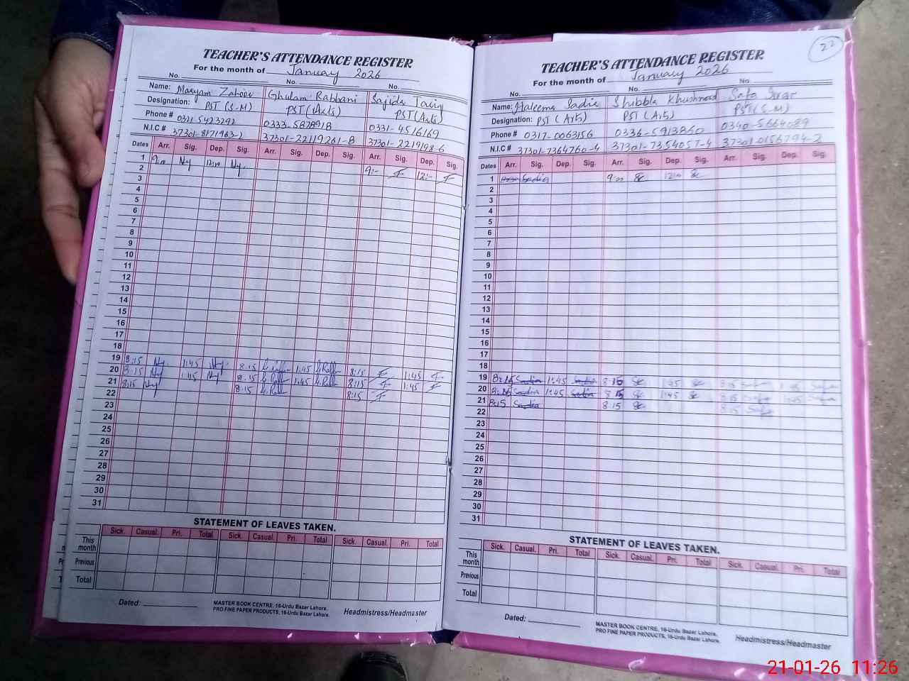 | CNIC | Full Name | Designation | R/C | Absence During Last Calender Month |